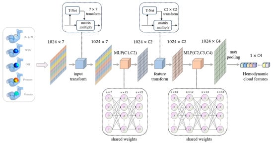 A PointNet-based model to extract hemodynamic cloud features was created; the model structure is shown in Figure 4. The model could directly extract hemodynamic cloud features with different dimensions. From the extracted hemodynamic clouds, 1024 points were randomly selected as input for the model. The process began with inputting these points into a T-Net to obtain transformation parameters, which generated a transformation matrix. The original data were then multiplied by this matrix to align the point cloud, ensuring that the point cloud maintains rotational invariance. Subsequently, a shared-weight multilayer perceptron (MLP) was used to extract features from each point in the cloud, resulting in a corresponding feature matrix with dimensions increasing from 7 to C2. This step captured the local features of the point cloud. Another T-Net was then used to align these features, followed by another shared-weight MLP that gradually increased the feature dimensionality to C4. Finally, max pooling was performed to aggregate the features, outputting a 1 × C4 dimensional feature defined as the hemodynamic cloud features.