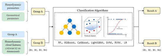 Five types of machine learning algorithms were utilized to classify the rupture status of IAs, as shown in Figure 5. And input features were categorized into two distinct groups, Group A and Group B. Group A contained only geometrical parameters and hemodynamic parameters; Group B consisted of Group A combined with different dimensions of hemodynamic cloud features. Group B was further divided into Groups B1, B2, B3, and B4, and the dimensions of hemodynamic cloud features employed by them were 1024, 64, 32, and 16, respectively. Each feature group was preprocessed with normalization before classification. Classification models were constructed using machine learning algorithms including XGBoost, CatBoost, Support Vector Machine (SVM), LightGBM, and Logistic Regression (LR). These models were applied to classify the rupture status of IAs applying Group A, Group B1, Group B2, Group B3, and Group B4 as feature inputs, respectively. Ten-fold cross-validation was employed to validate the models. The AUC, accuracy, sensitivity, and specificity of the models were calculated, and ROC curves were plotted.