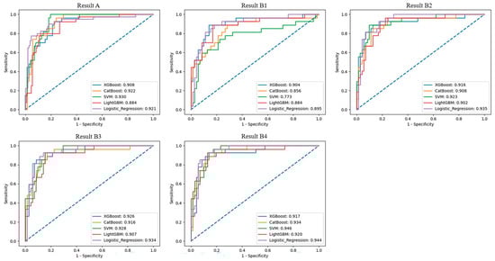 The constructed classification models were applied on Group A and Group B, respectively; for Group A, the accuracy for the XGBoost, CatBoost, SVM, LightGBM, and LR algorithms was 0.836, 0.816, 0.826, 0.832, and 0.885, respectively, with AUC values of 0.908, 0.922, 0.930, 0.884, and 0.921. For Group B, the accuracy for Group B1 was 0.846, 0.826, 0.816, 0.816, and 0.846, respectively, with AUC values of 0.904, 0.856, 0.773, 0.884, and 0.895. For Group B2, accuracy was 0.846, 0.836, 0.816, 0.826, and 0.885, respectively, with AUC values of 0.916, 0.908, 0.923, 0.902, and 0.935. For Group B3, accuracy was 0.857, 0.836, 0.836, 0.846, and 0.897, respectively, with AUC values of 0.926, 0.916, 0.928, 0.907, and 0.934. For Group B4, accuracy was 0.887, 0.857, 0.854, 0.857, and 0.908, respectively, with AUC values of 0.917, 0.934, 0.946, 0.920, and 0.944. Detailed results of the classification using various algorithms for Groups A and B are displayed in Table 1. The ROC curves are shown in Figure 6.