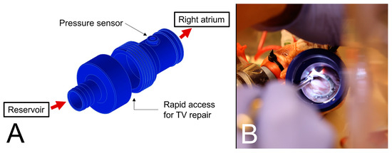 (A) A 3D CAD model of the right atrium connector. (B) Surgical implantation of the annuloplasty ring through the opened RAC.