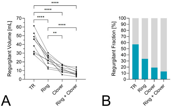 (A) Primary endpoint of regurgitant volume in mL shown for STR after ring annuloplasty, the clover procedure, and the combined repair. Regurgitation significantly decreased with all techniques compared to the baseline. Additionally, higher TR was present with the ring compared to the clover and the ring + clover. (B) The regurgitation fraction is illustrated for each condition with a reduction after the TVr procedures. ** p < 0.01, **** p < 0.0001.