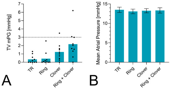 (A) The mean tricuspid valve pressure gradient after different procedures. A significant increase in the mPG was seen after the ring + clover compared to TR (p = 0.0025) and annuloplasty alone (p = 0.0039). (B) The mean atrial pressure in mmHg depicted for all conditions. No difference between the four experimental states was observed.