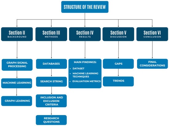 The remainder of the paper is organized as follows. In Section 2, the basic fundamentals of graph signal processing, machine learning, and deep learning are presented. Section 3 corresponds to the methodology adopted for the systematic review, such as the scientific databases considered, the search strings used, as well as the inclusion and exclusion criteria of the papers. Section 4 presents the main findings of the review. Section 5 brings a discussion, in which the identified gaps are addressed and future research directions in the area are presented. In Section 6, the final considerations are presented. Figure 1 summarizes the organization of the paper.