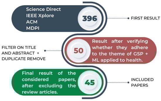 As a result, 396 papers were obtained. Refinements were performed to filter only the relevant papers for the purpose of this review. The first adopted strategy consisted of evaluating the title and the abstract of the papers and discarding those that did not adhere to GSP techniques applied to health. Additionally, repeated papers were also subtracted, so that 50 papers remained for analysis. Finally, 5 more papers were disregarded because they were review papers. As shown in Figure 2, a final sample of 45 papers remained for analysis.