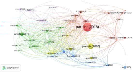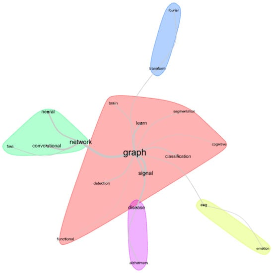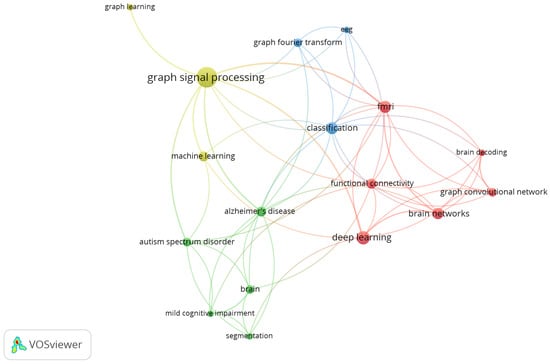 Figure 5 allows a complementary analysis. In this case, the co-occurrence of keywords is evaluated with the VOSviewer software, which is a tool for the elaboration of bibliometric networks [65]. The most recurrent terms are “graph signal processing”, “deep learning”, “graph learning”, “machine learning”, “fmri”, “connectivity”, “Alzheimer’s disease”, “autism spectrum disorder”, “brain”, “mild cognitive impairment”, and “graph fourier transform”. The nodes were divided into four clusters, so the most frequently related terms are grouped together in the same color. According to the terms shown in the figure, once again as expected, the application focused on neurology is highlighted in the terms in evidence.
