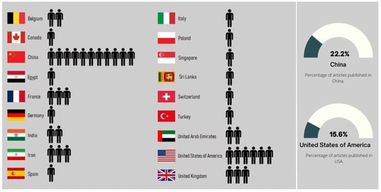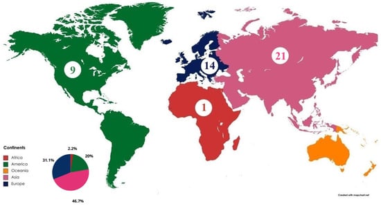 The distribution of publications by geographic location took into account the country associated with the affiliation of the first author of each paper. This made it possible to analyze the paper distribution by country and by continent, as shown in Figure 6 and Figure 7, respectively. In Figure 6, we verify that there are first authors affiliated with institutions from seventeen different countries, with emphasis on China, the United States of America (USA), Iran, and the United Kingdom; the first two countries have, respectively, ten and seven, and the last two countries have four, of the forty-five first authors.
