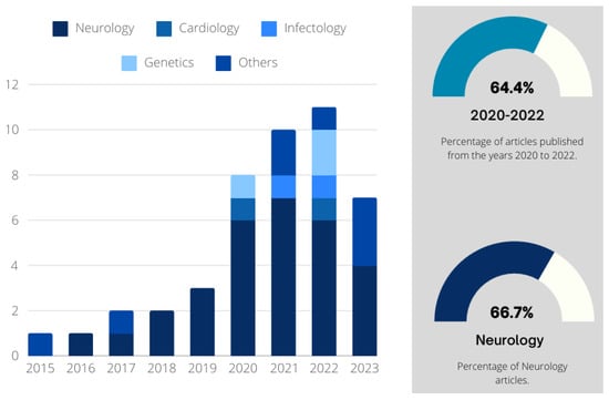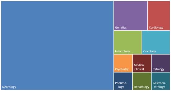 Figure 9 shows the eleven areas with publications by means of the tree map, in which the sizes of the squares of the specialties are proportional to the number of publications. Thus, considering the universe of 45 papers selected for this review, neurology is the most prominent (30), followed by genetics (3), cardiology (2), infectology (2), oncology (2), gastroenterology (1), medical clinic (1), cytology (1), psychiatry (1), pneumology (1), and hepatology (1).
