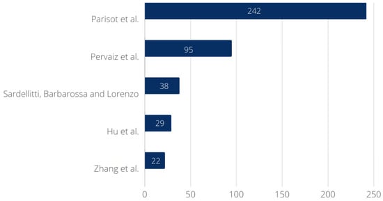 Figure 10 shows a bar chart of the number of Web of Science citations of the five most cited papers. The paper by Parisot et al. [67] is indicated as the most cited, with 242 citations. Pervaiz et al. [68] ranks second, with 95 citations. There are 38 works that use the study by Sardellitti, Barbarossa, and Lorenzo [69] as a reference, a number reasonably close to the fourth most cited, the work by Hu et al. [70], which has 29 citations. Finally, Zhang et al. [71] ranks fifth, with 22 citations. It can be inferred that there is a considerable difference in the number of citations of [67] compared to the others, which may indicate this work as recommended reading in the area.