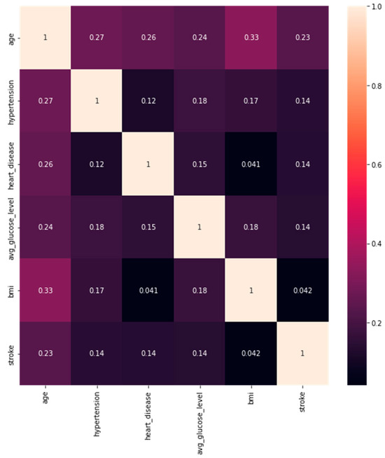 Figure 3 shows the correlation between the numerical variables within the first dataset. There are six numerical variables, and none of them shows a strong correlation with the others. However, a weak correlation of 0.33 was identified between the variables age and BMI. Another weak correlation of 0.27 was identified between hypertension and age. The target variable, ‘stroke’, has no strong correlation with the other input variables.