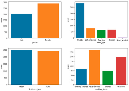 Figure 4. Count plot for attributes ‘gender’, ‘work type’, ‘residence type’, and ‘smoking status’.