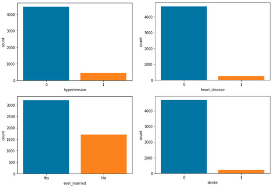 Figure 5 illustrates the remaining four different count plots for the binary variables in the first dataset. Firstly, 65% of the patients had no history of hypertension, whereas 35% of the patients had hypertension. In terms of heart disease, 95% of the patients had no history of heart disease, while the remaining 5% of the patients had heart disease. Similarly, 95% of the patients were married. Lastly, for the target variable ‘stroke’, 95% of the patients in the first dataset had not had a stroke, which means that the dataset is imbalanced. Thus, a class balancing technique called SMOTE was implemented during data transformation.