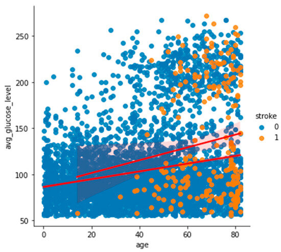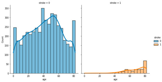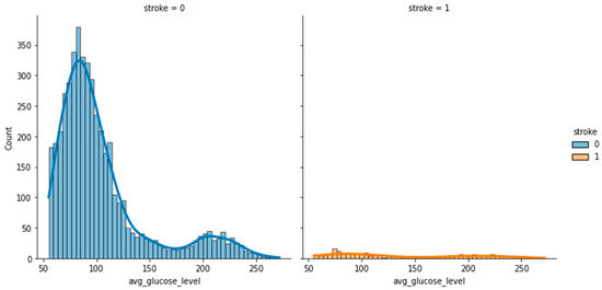 Figure 8 shows the histogram of the average glucose level categorized based on the target variable ‘stroke’. It indicates that patients who had had a stroke had a low average glucose level of 90–110. A similar trend is also seen in Figure 9, where patients who had had a stroke had an average glucose level of less than 100.