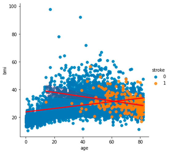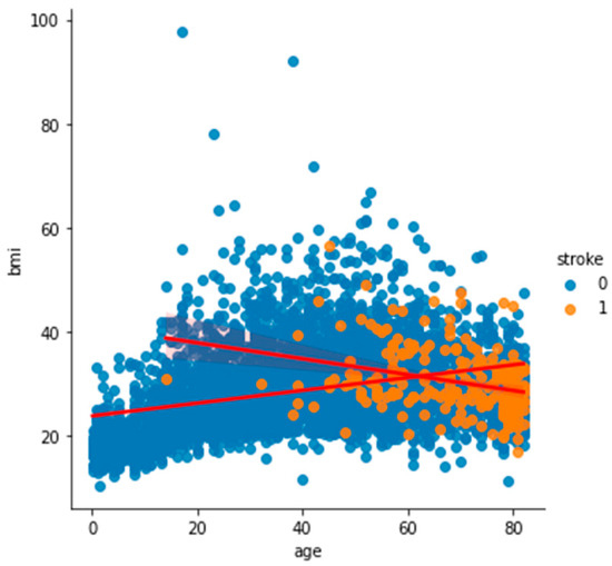 Figure 7. Scatter plot of age against BMI based on stroke.