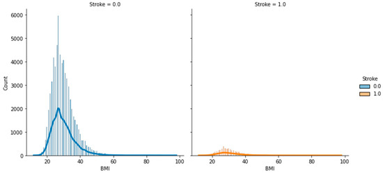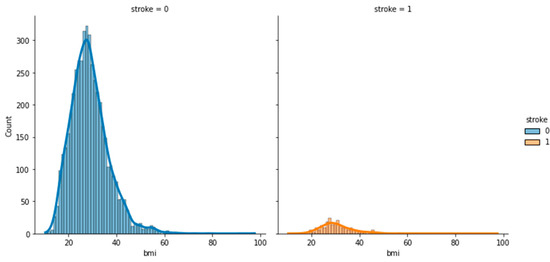 Figure 10 shows the histogram of BMI based on stroke, which indicates that most patients who had suffered from stroke were in the range of 30–35. Similarly, in Figure 11, patients who had had a stroke had the BMI of an overweight person, as a normal BMI is between 18.5 and 24.9. In summary, patients with these characteristics are at a higher risk of experiencing a stroke: being overweight, having low average glucose levels, and being above the age of 40.
