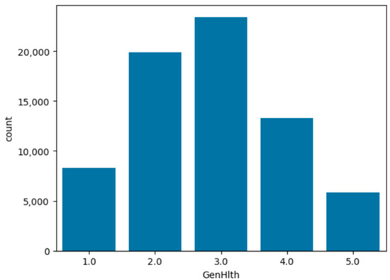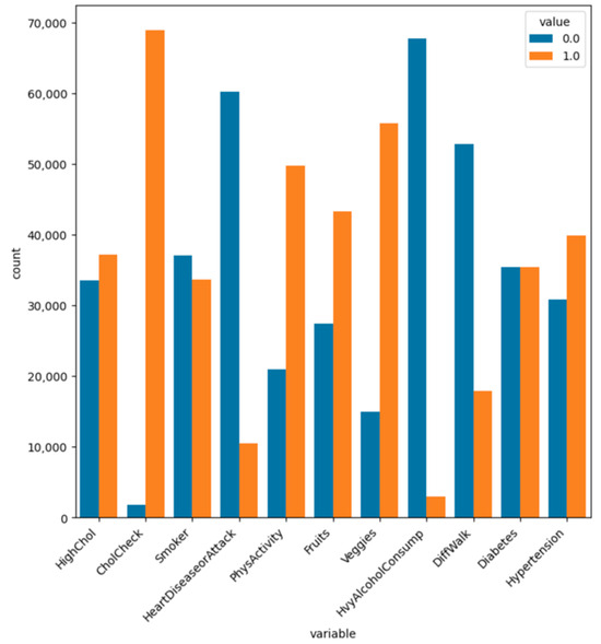 Figure 13 shows the count plot for all the binary variables in the second dataset. Firstly, 52% of the patients had high cholesterol, and 97% of the patients had performed at least one cholesterol check in the past 5 years. In terms of smoking, 52% of the patients had never smoked, and 85% of the patients did not have heart disease or had not experienced a heart attack. Additionally, 70% of the patients had performed physical activities in the past month. Regarding fruit and vegetable consumption, 61% and 78% of the patients ate one or more fruits and vegetables every day, respectively, and 95% of the patients did not consume heavy alcohol; further, 74% of the patients had not had difficulty in walking in the past month. However, 50% of the patients suffered from diabetes despite their good eating habits and exercise, and 56% of the patients suffered from hypertension.
