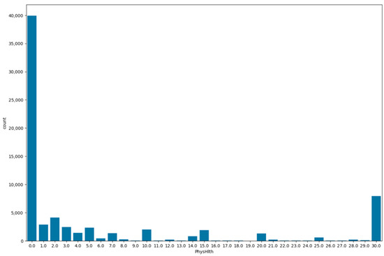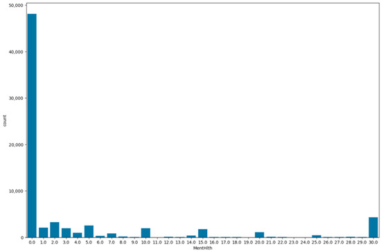The variable ‘mental health’ is visualized on a bar plot as shown in Figure 16, indicating the number of days on which the patients had poor mental health. A total of 68% of the patients did not feel that they had a poor mental health day, and 10% of the patients felt like they had had 1 to 5 days of poor mental health. On the other hand, 6% of the patients felt like every day for the past 30 days, they had poor mental health.