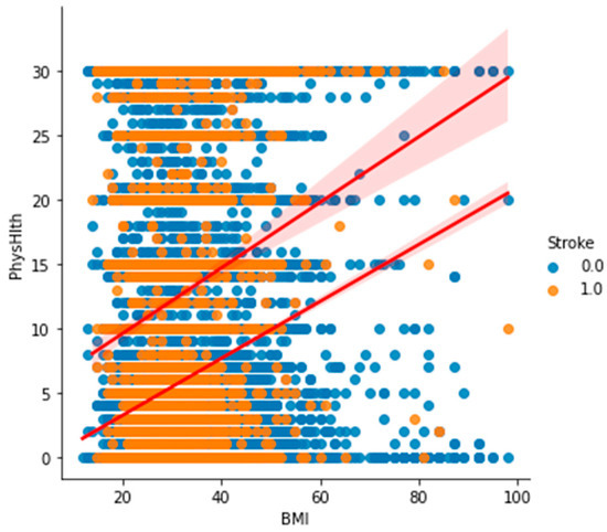 Figure 19. Scatter plot of BMI against physical health based on stroke.
