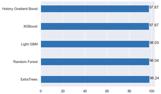 Figure 20 shows the top five machine learning models, based on the accuracy on the first dataset. Both light GBM and random forest algorithms performed well and delivered high accuracy. However, the best-performing model was the ExtraTrees classifier.