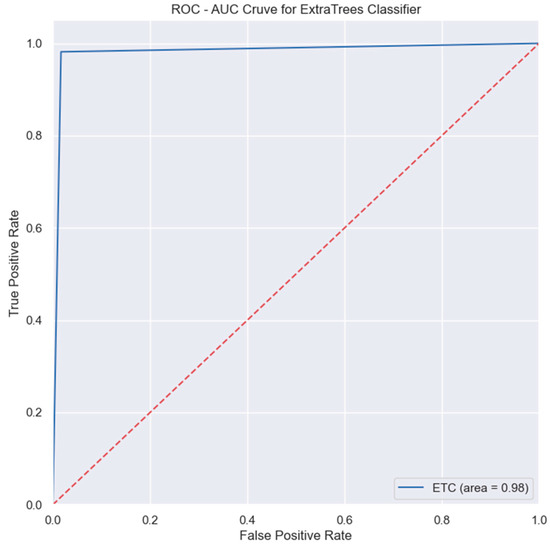 It is shown that the ExtraTrees classifier is the best-performing model, as it achieved an accuracy of 98.24%; despite the SVM model by [8] having a better accuracy of 99.99%, the author did not provide the AUC score, which is an important aspect when evaluating a model. The authors in [8,10,11,15] used the same dataset, but their models did not produce significant results, as they used different methods of data pre-processing and transformation.