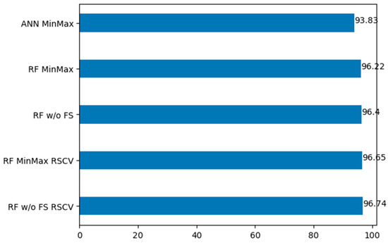 Figure 22 shows the top five models based on their accuracy on the second dataset. It shows that applying the standard scaler on random forest on the second dataset reduces the model performance significantly, while applying the minmax scaler on random forest produces a better result. As in the first dataset, the ANN algorithm is shown to be suitable for stroke prediction on the second dataset, achieving an average accuracy of 92%. However, the best-performing model on the second dataset is random forest without feature scaling and applying randomized cross-validation, with 96.74% accuracy. Additionally, as seen in Table 3, the AUC of the model is 0.97, which indicates that the model can differentiate the target class distinctively. However, the GANN algorithm is not listed in the top five, which indicates that it is not suitable for stroke prediction. The results of the performance of the applied models on the second dataset are presented in Table 6.
