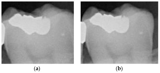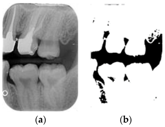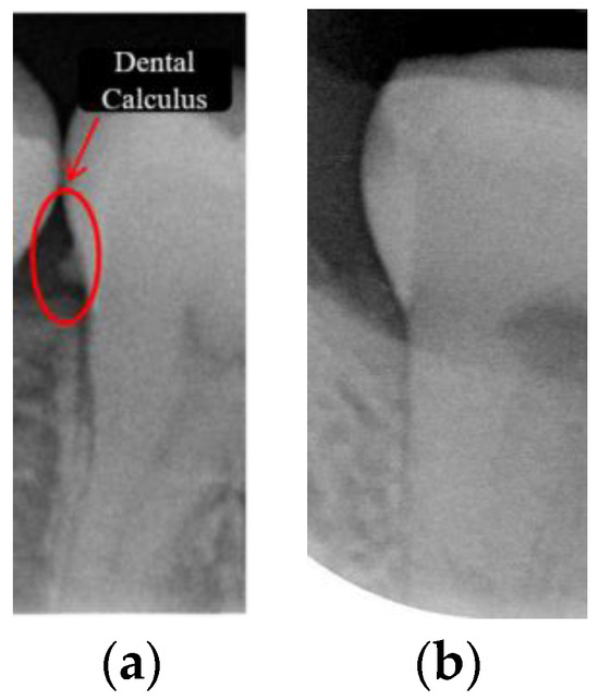 Dental calculus symptoms on a BW image: (a) dental calculus symptoms; (b) absence of dental calculus symptoms.
