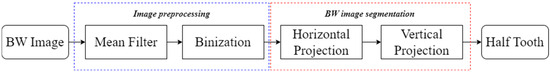 This step aims to effectively separate the target of interest (individual tooth images) from the background (non-dental regions), as illustrated in Figure 4. This process involves multiple image-processing steps and identifies peaks and valleys for segmentation through accumulated pixel values. Considering that dental calculus symptoms often occur on both sides of the teeth, to enhance the effectiveness of CNN training, this study divided each tooth into two equal parts vertically.