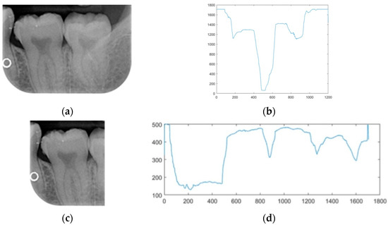 This study employed image segmentation to enhance the precision of diagnosing dental calculus symptoms by segmenting the BW image into individual teeth. At first, horizontal projection was utilized to detect the coordinates of the pixel accumulation with the lowest value in the BW image (refer to Figure 6b). Subsequently, based on these coordinates, the image was divided into upper and lower parts, as illustrated in the segmentation results shown in Figure 6a. Following the initial step, vertical projection was employed to identify the spaces between the teeth. A threshold of 400 for the total pixel values was established to facilitate the identification of multiple points falling below this threshold (refer to Figure 6d). Subsequently, when cropping the image, 50 pixels were subtracted from the smaller X coordinate, and 50 pixels are added to the larger X coordinate to prevent an inadvertent truncation of the tooth edges. The segmented individual teeth are depicted in Figure 6c.