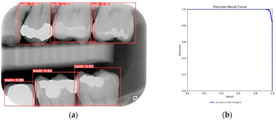 After training the YOLO object-detection models, this study tested unlabeled, and untrained the BW images. The test results are illustrated in Figure 10. The four object models used in this study, along with the image-augmentation technique, successfully identified all the teeth of interest in the BW images. After the image-segmentation stage, the extracted regions were delineated by the red boxes in Figure 10a, and the PR curve is shown in Figure 10b. The results extracted are depicted in Figure 11, effectively capturing the individual teeth and their edges and enabling further image-enhancement and CNN training steps.