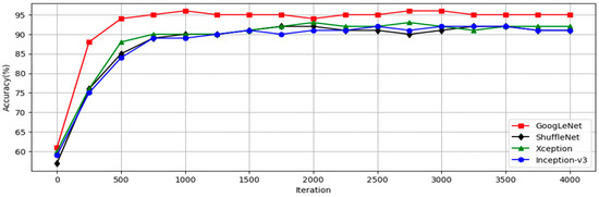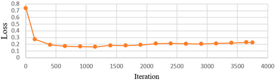 This research utilized a CNN model to identify symptoms of dental calculus to reduce the workload of dentists and to minimize the chances of misdiagnosis. Image-enhancement methods were employed to improve the accuracy by enhancing characteristics that might not be clearly visible in the images. With the CNN model-training accuracy shown in Figure 12, it can be seen that the accuracy of each model increases rapidly within the first few hundred iterations and then gradually stabilizes. The GoogLeNet model shows the most outstanding performance, achieving the highest accuracy at all iteration counts, while the other models stabilize at similar accuracy levels after approximately 1000 iterations. This indicates that GoogLeNet performs better in this binary classification task. Figure 13 shows the GoogLeNet loss function curves during training. Table 12 provides training process details of GoogLeNet. The results offer insight into the model’s training progress and effectiveness, demonstrating successful dental calculus symptom identification. Image-enhancement techniques improved the performance, as visualized through the training convergence and loss function curves, highlighting the model’s effectiveness in diagnostics and patient care.