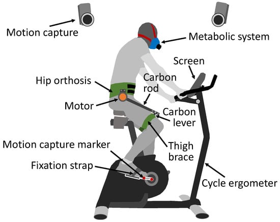 Experimental setup including cycle ergometer with screen, motion capture with two markers at each crank (red), the participant wearing the metabolic system (blue), and the GuroX hip exoskeleton. The exoskeleton includes the human–machine interface consisting of the hip orthosis and both thigh braces (green) and one motor (orange) at each hip, which use a carbon rod and a carbon lever to apply the motor torque to each thigh.