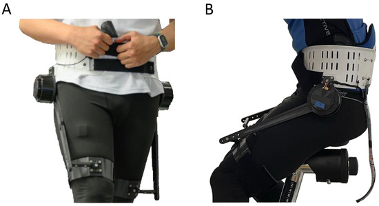 GuroX hip exoskeleton developed for lower limb assistance, perturbations, and training shown for scenarios of assisted (A) walking and (B) cycling.