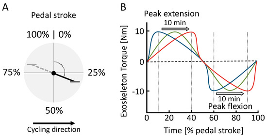 where A is a constant denoting the maximum hip torque, which was set to 10 Nm for both hip flexion and extension, is the normalized crank angle (pedal stroke in percentage), and is the crank angle. An angle of zero is defined as the position where the pedal is at the highest point (TDC). and denote the normalized angle of the peak extension torque and the peak flexion torque, respectively. Considering the extension motion and the flexion motion are symmetric during cycling, we defined .