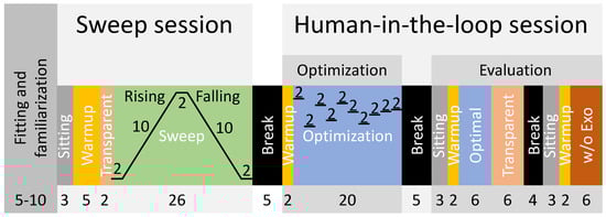 Experimental protocol including the fitting and familiarization and two experimental sessions: the sweep and the human-in-the-loop sessions. The human-in-the-loop session consists of the optimization and the evaluation part. The numbers indicate condition times in minutes.