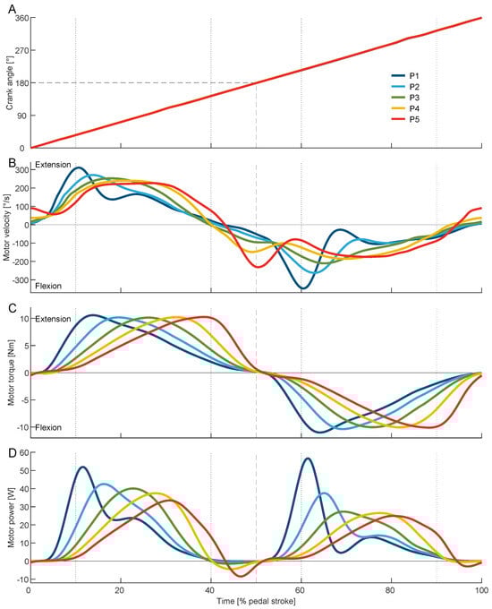 Average crank angle (A), motor velocity (B), motor torque (C), and motor power (D) during the pedal stroke for the five phases P1 to P5 (peak extension torque P1 10–13%, P2 16.75–19.75%, P3 23.5–26.5%, P4 30.25–33.25%, P5 37–40%, and peak flexion torque with 50% offset). Dotted vertical lines indicate the earliest and latest applied peak extension torque. Dashed lines indicate the middle of the time of the pedal stroke as well as the crank angle at bottom dead center (BDC). For the crank angle, the results of P1 to P5 overlap each other.