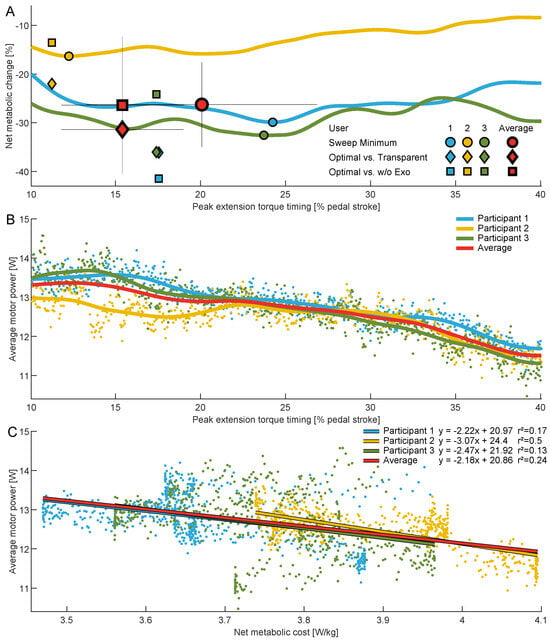 (A) Net metabolic change across the range of assessed torque timings during cycling relative to . Solid lines are participant-specific averages across the sweep session. Circles indicate sweep session minima compared to the transparent condition, diamonds indicate the optima from the human-in-the-loop optimization compared to the transparent condition, and squares indicate the optima from the human-in-the-loop optimization compared to the without exoskeleton (w/o Exo) condition.The results for each participant are shown in blue, yellow, and green, respectively. Group averages are indicated in red and include standard deviations (thin black lines). (B) Average motor power for each participant and the group average across the range of assessed torque timings. Data points indicate participant-specific samples used to determine the mean. (C) Average motor power versus net metabolic cost for the individual participants and the group average. Data points indicate participant-specific samples, and the solid lines represent first-degree polynomial fits, where coefficients and r-squared values are also provided.