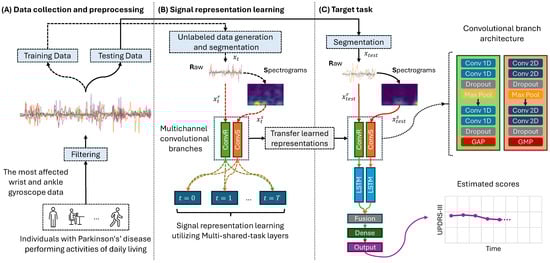 The network for UPDRS-III estimation in the target task, as illustrated in Figure 1C, and the network for signal representation learning share the same multichannel CNN architecture. In addition to the convolutional branches, the UPDRS-III estimation network includes two LSTM layers, each with a size of 128 and a dropout rate of . The outputs of these layers are then fused and passed to a dense layer with a size of 256 before reaching the output layer, which estimates the UPDRS-III scores. This architecture is also shared across the series of deep neural networks discussed in Section 3.3. These hyperparameters were selected using a random validation split of the training data, employing Bayesian optimization. The methodology’s Python code implementation is available on GitHub [38].