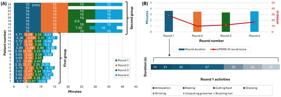 Data visualization from the study on 24 PD patients. (A) The duration (in minutes) and the number of rounds each participant completed. Each bar represents a round of data, with the height indicating the round’s duration. (B) A detailed breakdown of one participant’s activity duration across the four rounds. The red line shows the UPDRS-III scores in each round.
