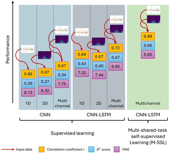 The proposed M-SSL multichannel CNN-LSTM performance metrics alongside the introduced supervised single and multichannel CNN and CNN-LSTM. The red arrows denote the model’s input data.