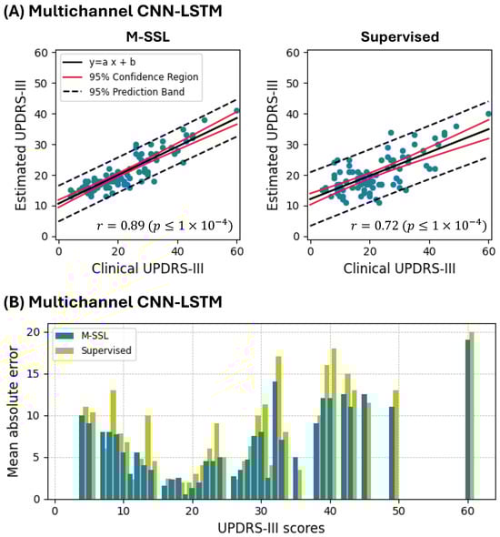 A performance comparison of estimating the UPDRS-III score between the proposed M-SSL and supervised multichannel CNN-LSTM. (A) depicts the clinical vs. estimated UPDRS-III scores for each round. (B) displays the mean absolute error for UPDRS-III scores.