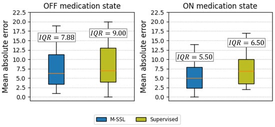 The mean absolute error of the estimated UPDRS-III scores before and after medication (OFF and ON medication states) using the proposed M-SSL and supervised multichannel CNN-LSTMs. The Interquartile Range (IQR) was calculated for each.