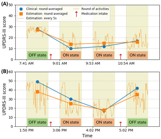 The UPDRS-III estimations over time by the proposed M-SSL multichannel CNN-LSTM compared to the clinical UPDRS-III scores for two PD patients. (A) illustrates a patient showing improvement in PD symptoms over time. (B) displays a patient experiencing the return of PD symptoms before the next dose of medication.