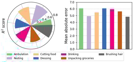 The coefficient of determination and the mean absolute error of the UPDRS-III estimations by the proposed M-SSL multichannel CNN-LSTM during patients’ activities.