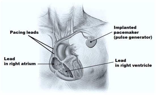 Cardiac pacemakers are implanted as depicted in Figure 1. They are used for handling bradycardia, which is a cardiac rhythm usually less than 60 beats/min. The pacemakers aim to restore the normal electromechanical activity of the heart by generating electrical pulses []. Sending an electrical pulse to both ventricles to aid them in beating in a more coordinated and synchronized mode recovers the normal ventricular contractility and improves the pumping efficiency of the heart []. The main components of traditional pacemakers are pacing leads and a pulse generator []. The pulse generator includes the battery of the pacemaker in addition to the circuits that transfer stimulation to the heart only in case of arrhythmia. Pacemaker leads are electrical conductors covered by insulators. The electrical impulses are carried by the leads from the pacemaker to the heart and the sense amplifiers signal from the heart to the pacemaker [].