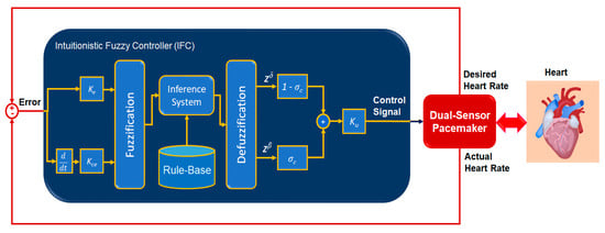 In this article, a novel IFLC has been successfully developed for controlling the electrical pulses of dual-sensor pacemakers. The developed controller can assist cardiac patients in achieving the preset heart rates with minimal RMSEs of 0.17 to 0.24 during three different daily activities: resting, walking, and jogging. The main parameters of the developed IFLC such as the input–output control gains and the hesitancy value are carefully tuned to achieve a desirable performance of tracked preset heart rates, as shown in Figure 7, Figure 8, Figure 9, Figure 10, Figure 11 and Figure 12. Moreover, the comparative evaluation of the developed IFLC versus other closed-loop controllers in the literature showed the outperformance of applied intuitionistic fuzzy for controlling therapeutic medical devices like implanted pacemakers.