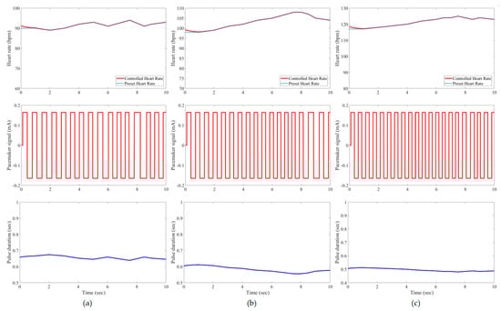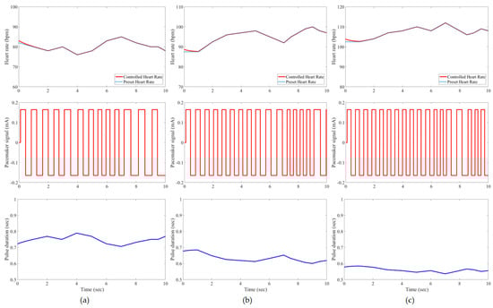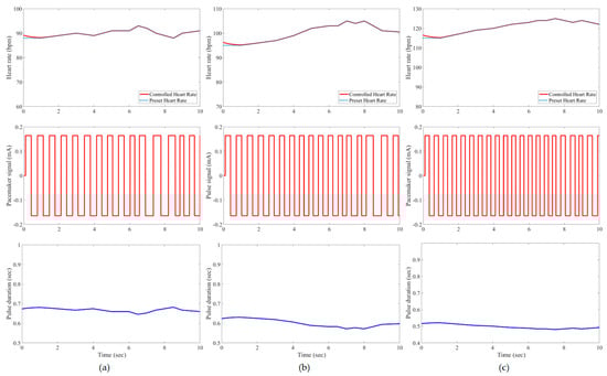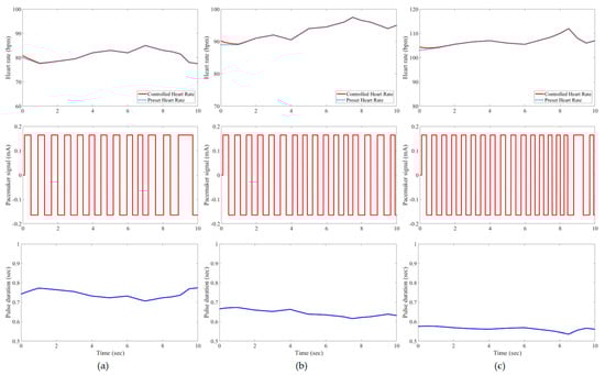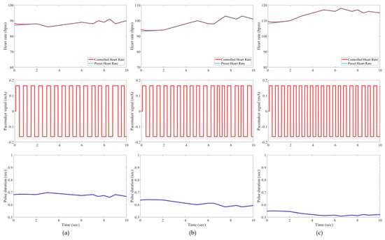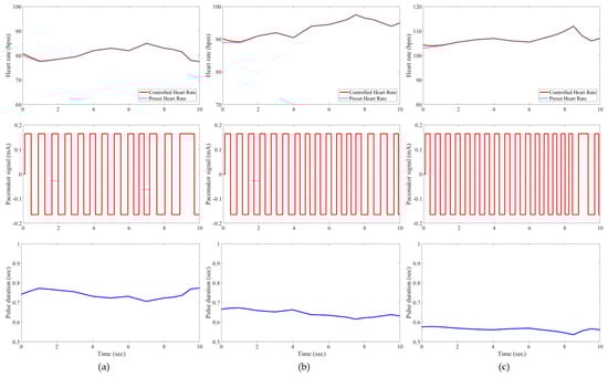 Results of the tested case 1 using developed pacemaker control: (a) at rest; (b) walking; and (c) jogging. The pulses of the pacemaker are shown in the second row, and the control signal is shown in the third row.