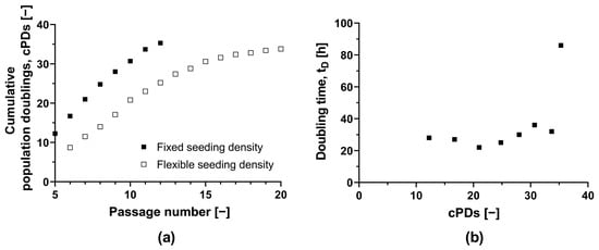 Based on the findings reported in Section 3.1, the XPN10 was inoculated with 4 × 103 cells cm−2 using growth medium without antibiotics. We allowed the optimal attachment time (Section 3.1.1) followed by an intermittent stirring, inoculation and attachment strategy: 3 min stirring at 23 rpm (to ensure proper cell distribution within the reactor), followed by 2.5 h without stirring for attachment, another 3 min of stirring at 23 rpm and another 2.5 h without stirring. After 24 h, all cells had either attached or lysed following apoptosis (none were found in the supernatant). Nevertheless, population doublings were calculated assuming that all cells had completely attached to the XPN10 growth surface. The calculated cPD is therefore underestimated, because fewer cells attaching during the early phase would result in an even higher cPD.