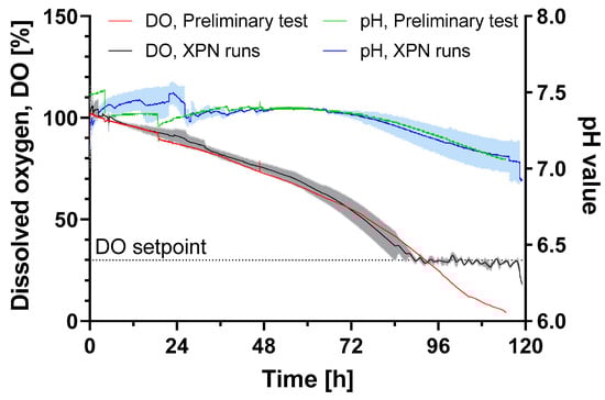 All surface markers (CD105, CD73 and CD29) were present on HLSCs expanded in the XPN10. A glucose consumption rate of 1.8 ± 0.1 × 10−11 g cell−1 h−1 was observed, which was 3-fold higher compared to human periosteum-derived stem cells expanded in an XPN []. However, glucose limitation did not occur until the end of the cultivation period. The oxygen supply was also sufficient throughout the cultivation, and the pH remained above the critical value of 7 (Figure 2).