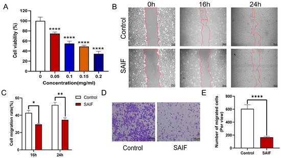 Figure 1. Inhibitory effect of SAIF on HUVEC proliferation and migration. (A) Effect of SAIF on the proliferation of HUVEC cells. HUCEV cells were treated with various concentrations of SAIF for 48 h. The CCK8 assay was used to assess the vitality of the cells. (B) The migration of HUCEV cells treated with 0.2 mg/mL SAIF for 16 and 24 h was assessed using a scratch assay. (C) Image J 1.52a software was used to quantify the cell migration rate in the scratch assay. (D) The migration of HUCEV cells treated with 0.2 mg/mL SAIF for 16 and 24 h was assessed using Transwell assay. (E) Image J 1.52a software was used to quantify the cell migration rate in the Transwell assay. The results are the mean ± SD values of three experiments performed in triplicate, * p < 0.05; ** p < 0.01; **** p < 0.0001.