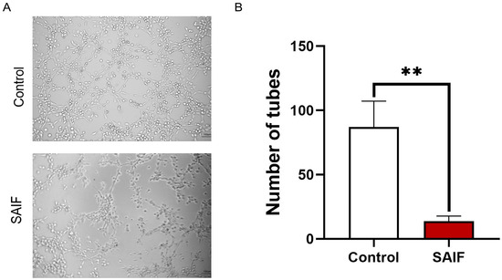 Figure 2. Inhibitory effect of SAIF on HUVEC tube formation. (A) HUVEC cells were treated with SAIF for 6 h. The tube formation in HUVEC was observed under microscopy. (B) The number of tubes formed by HUVECs was counted by ImageJ 1.52a software. The mean ± SD of three separate experiments is used to express the values, ** p < 0.01.