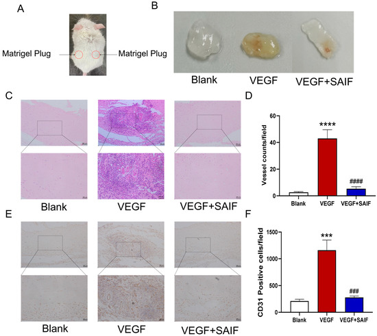Figure 3. SAIF inhibits exogenous VEGF-induced vascular neovascularization of matrigel plugs in mice. (A) Diagram of the matrigel plugs in mice. (B) The mixed matrigel plugs containing SAIF (0.2 mg/mL) and VEGF (250 ng/mL) were injected subcutaneously into the dorsal side of the mice and were taken for photographs after 7 days. (C) Representative images of H&E staining of matrigel plugs from mice (100×, 200×). (D) The number of tubes in the matrigel plugs is presented in the form of a graph. (E) Immunohistochemistry staining for CD31 in the matrigel plugs of mice (100×, 200×). (F) The graph illustrates the total number of CD31-positive cells. The values are the mean ± SD values of three experiments performed in triplicate. *, for blank vs. VEGF group, *** p < 0. 001; **** p < 0.0001; #, for VEGF vs. VEGF + SAIF group, ### p < 0.001; #### p < 0.0001.